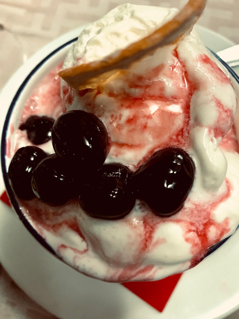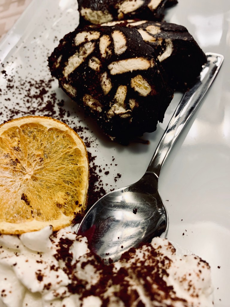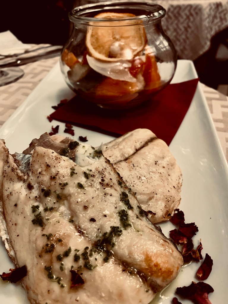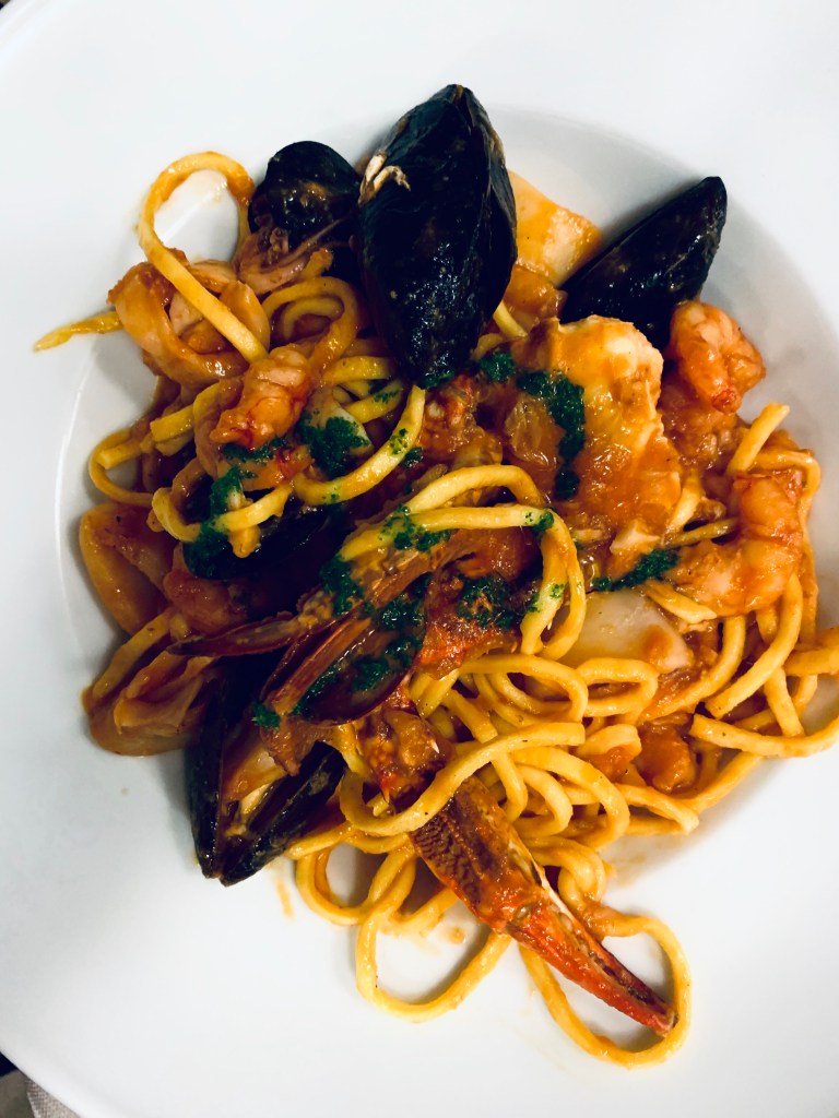 In terms of food, the quality is really good. I had a fish-based dinner; as a starter I had a salmon tartare served with maracuja ice cream. The salmon was really good and the match with maracuja is really witty. Then, I had spaghetti with crustaceans, shrimps, mussels (etc.) and I continued with fish served with mixed pickled vegetables. Finally, I couldn’t help but order the dessert: I had chocolate salami, which was really good even though it was served cold. Also, you can find a pic of fiordilatte ice-cream served with black cherry; I didn’t eat it, but I tasted it and it was really yummy.