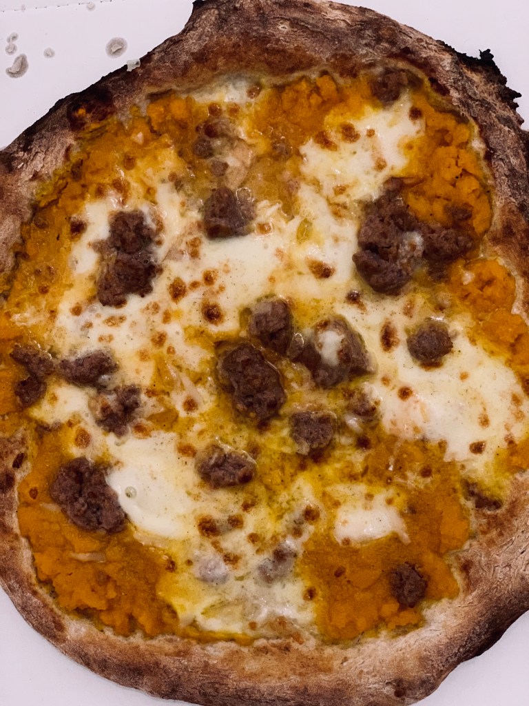 I ordered “Zuccarella”, a pizza made of whole dough, with pumpkin sausages and scamorza.